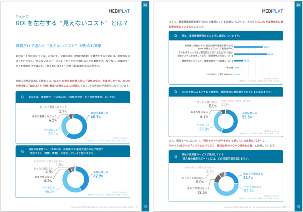 当社が実施した調査では、92.8%の企業が産業医サービス導入時に「価格の安さ」を重視した一方、89.2%が運用後に「追加コスト(時間・費用)が発生した」と回答しており、表面的なコスト比較だけでは真の投資効果を判断できない実態が明らかになっています。